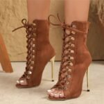 Estos elegantes botines de tacón alto son perfectos para añadir un toque de glamour a cualquier outfit. Fabricados en un suave material de ante en un atractivo tono marrón, cuentan con un diseño de cordones en la parte delantera que aporta un estilo único y moderno.