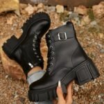 Botas Negras con Suela Chunky: Estas botas negras son el epÃtome del estilo urbano y moderno. Con un diseño robusto y suela chunky, ofrecen tanto comodidad como un toque atrevido. Los detalles de cordones y la hebilla lateral añaden un aire de sofisticación. Perfectas para combinar con jeans o faldas, son ideales para un look casual y contemporáneo.