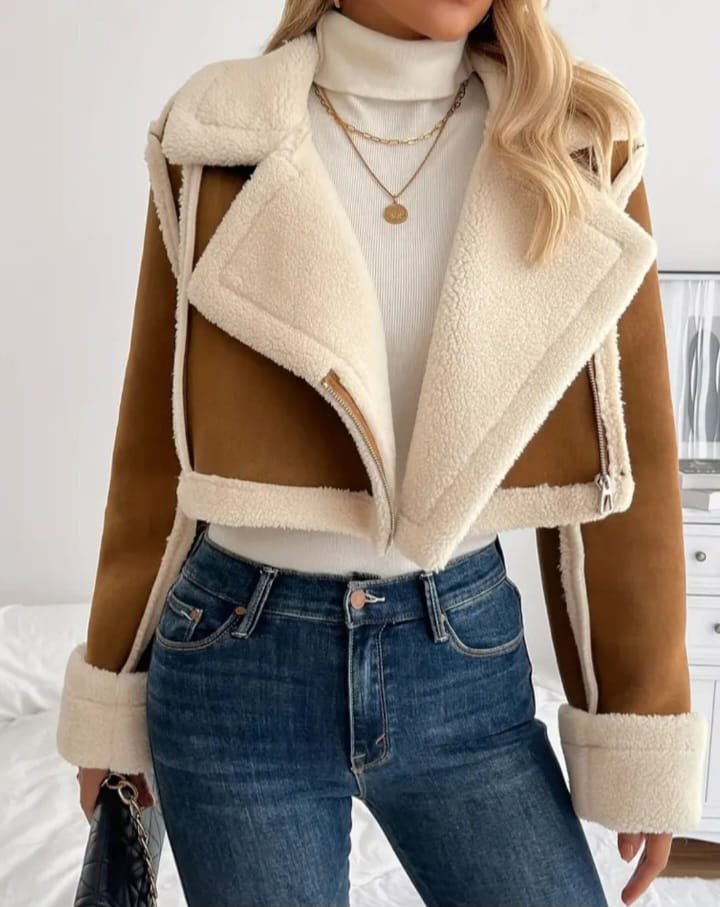 Este producto es una chaqueta estilo chaleco o cropped, diseñada para combinar estilo y comodidad. Está confeccionada con un material de felpa o borrego en tonos crema y marrón, que le da un aspecto cálido y acogedor. La chaqueta tiene un diseño de corte cropped, con un cuello amplio y detalles de costuras y cierres en tonos contrastantes que resaltan su estilo moderno.